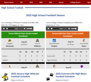 Showcased here: a 300x250px classified ad, layouts created within the WordPress theme with no modification to CSS; the Extreme Weather section- management agreed we would continue to need a place for multi-day weather event news, the Destination Guide- all content written by me in 2011 and regularly updated with my major style update in 2021, the look that carried over into the more/media section, some views of the responsive and past mobile layout I developed, my sports page design, and more promotion examples.